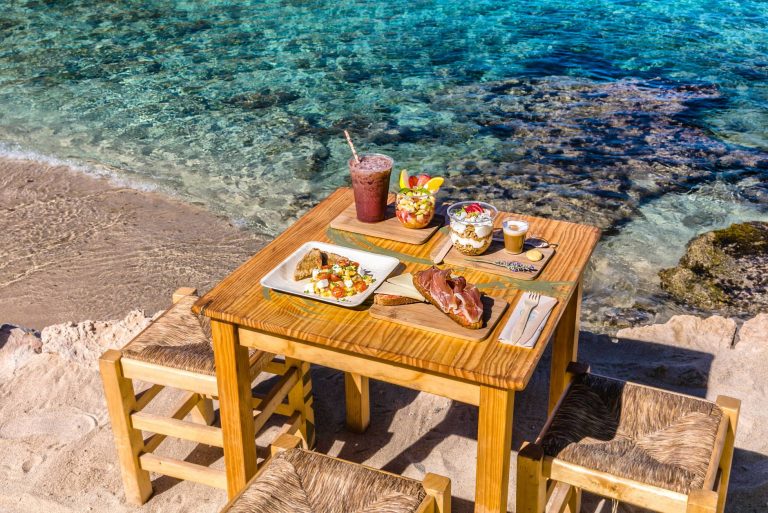 It has a very international menu, ranging from the concentration of aromas of Moroccan couscous and tagines to vegetarian burgers or banana cake. An experience to try in this most different beach bar in the world. Without forgetting the delicious drinks they offer. There is nothing better than a good swim in turquoise waters and drinking your favorite cocktail.