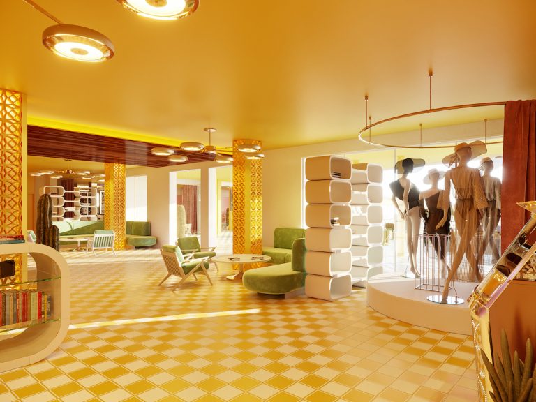 The hotel will have two pool areas, one pink and the other yellow, being the main colors of the establishment in which these two areas will be separated by a parasol-shaped DJ booth.