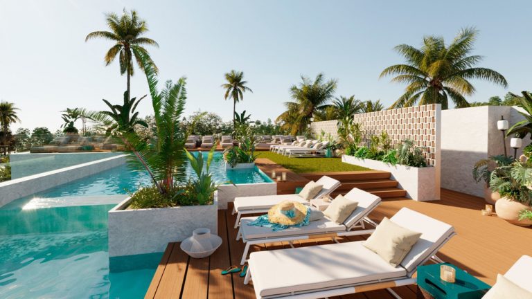 The hotel has 184 boho-chic rooms and suites, an OKU Signature Suite of 140 m2, a four-bedroom independent villa with a private pool, penthouses with sea views, two hotel pools and another semi-private pool serving guests. the 6 Swim-up rooms. In addition, it has two restaurants and an intimate spa.